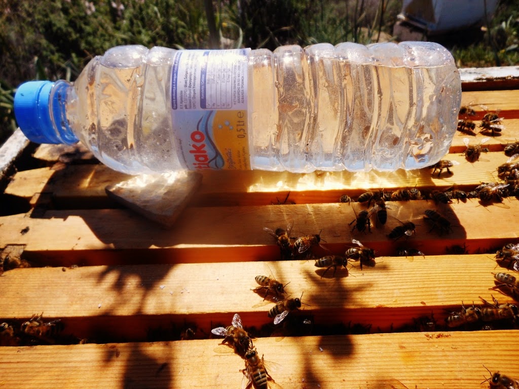 Στη συνέχεια γεμίζω πλαστικά μπουκαλάκια νερού 0,5 του λίτρου και αφού ανοίξω μια μικρή τρύπα με μια βίδα, στο μπροστινό μέρος του μπουκαλιού ,το τοποθετώ με την τρύπα προς τα κάτω, ανάμεσα στους κηρηθροφορείς , την αρχή θα τρέξει λίγο σιρόπι ,αλλά μετά σταματάει να τρέχει, φτάνει βέβαια να έχουμε βιδώσει καλά το καπάκι και να μην υπάρχει κάποια άλλη τρύπα στο μπουκάλι και ιδιαιτέρα στο πάνω μέρος.