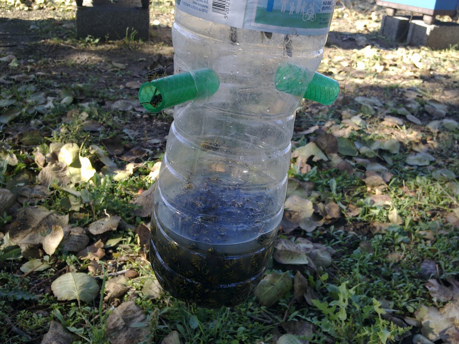 Ο μονος αποδοτικός τρόπος που βρήκα για να τις αντιμετωπίσω είναι αυτά τα μπουκάλια με πορτοκαλάδα ( τοπικό αναψυκτικό) τύπου Φαντα το οποίο αλλάζω κάθε 2 ημέρες. Τα μπουκάλια είναι κρεμασμένα στο ύψος και πίσω απο τις κυψέλες